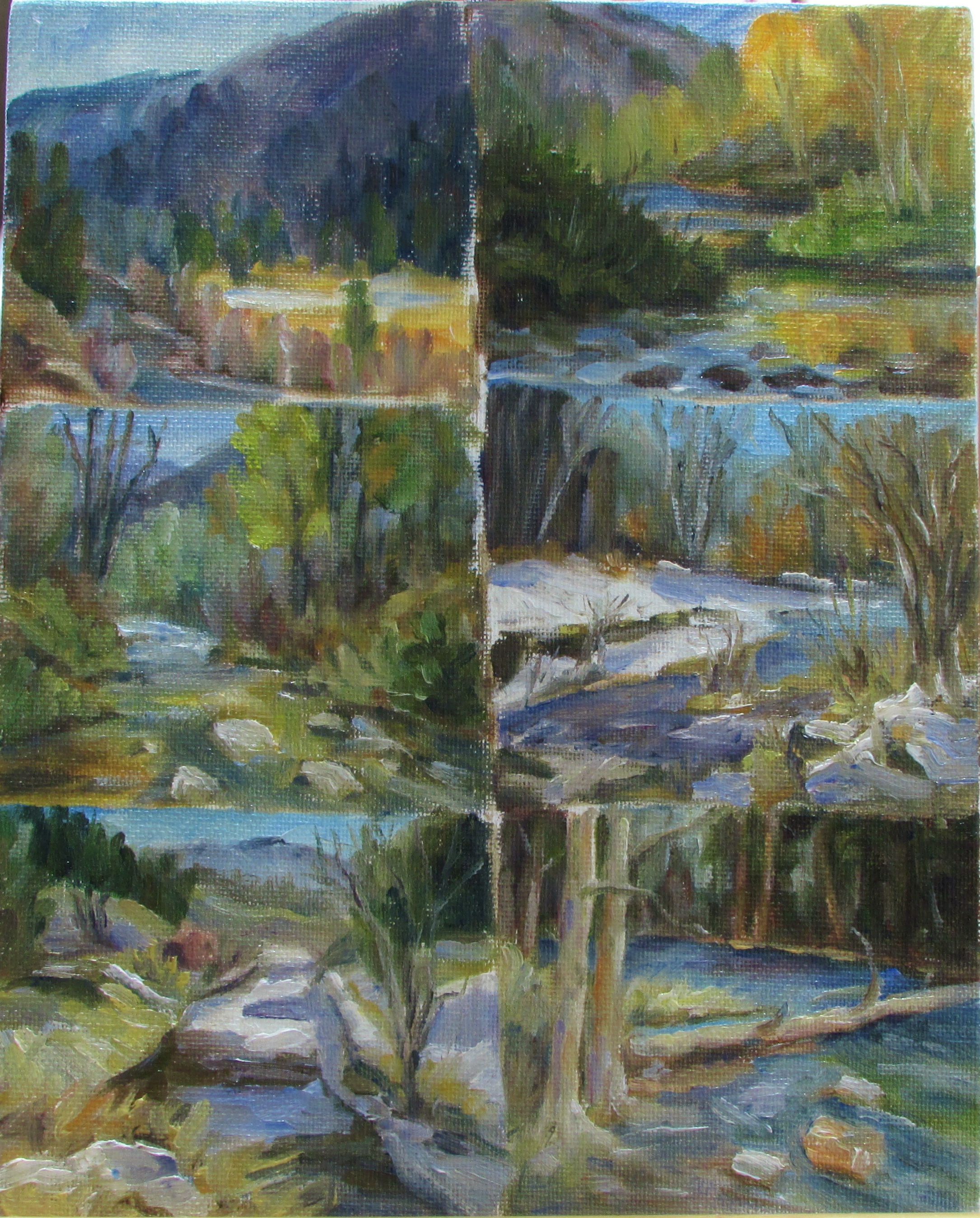 This is a collection of 4×4 paintings that I did this week. They are copies of larger paintings by a friend who’s work I particularly like. His brush strokes are quick and sketchy and his paint is quite thick and textural. Another thing I like about it is his color choices. He uses a few different colors than I was using and I enjoyed adding these to my pallet. (the new ones were sap green, cad orange light, and yellow ochre)