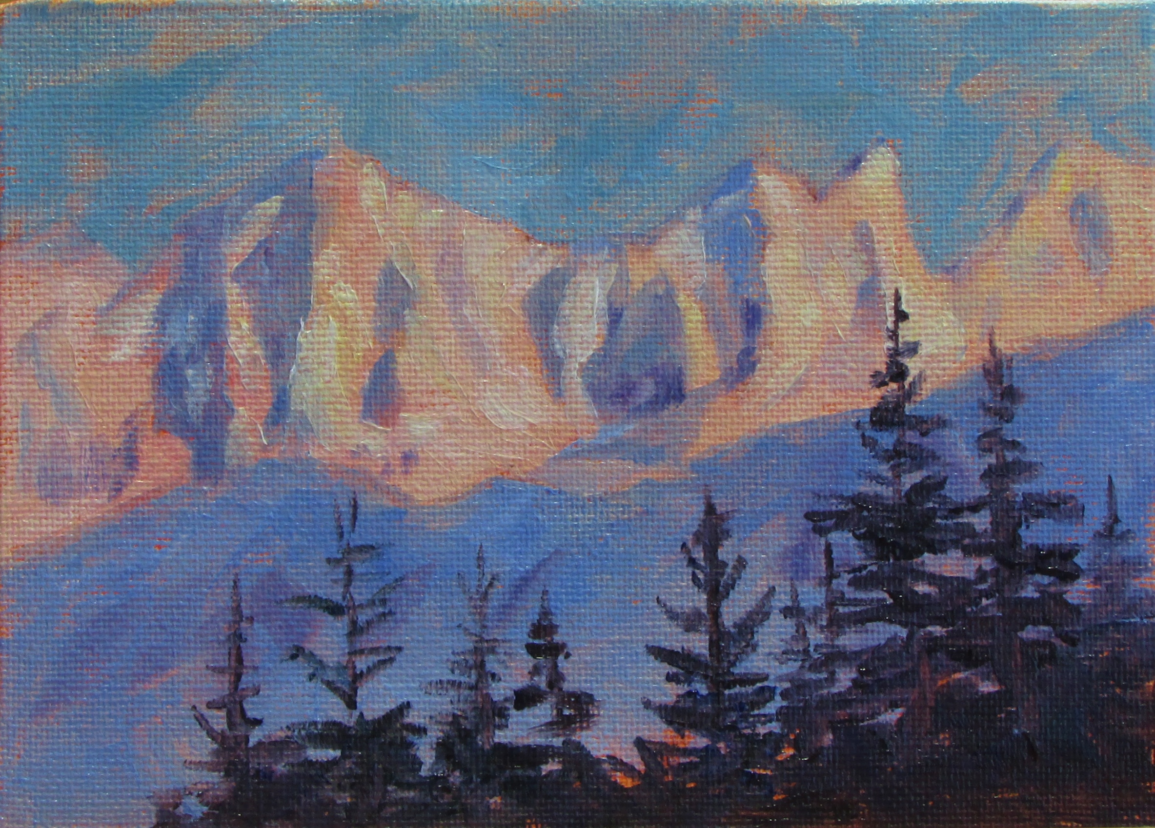 This is a little (5×7) study that I did to practice the color, temperature and value of the light.The sun hits the mountain peaks like this in the winter here in Juneau. (on one of the maybe 10 sunny days we get) It is so beautiful! I want to be able to capture the extreme impact that it has. I think this is quite close to how it looks. I’m am going to do several more this week. It will be my focus.