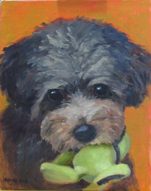 This was done for my niece. It was actually one of the more difficult pets I have done. It was difficult to find a photo of her that was detailed enough to paint from. I think it turned out cute, especially with the little dinosaur toy. The background is an interesting thing, I never know what color to use. The panel was underpainted with light red and when I put ochre over it, it came out this orangy tone, which I sort of liked. It wasn’t what I was going for but I thought it worked well, so I left it. I guess it is a good example of one of those happy accidents.