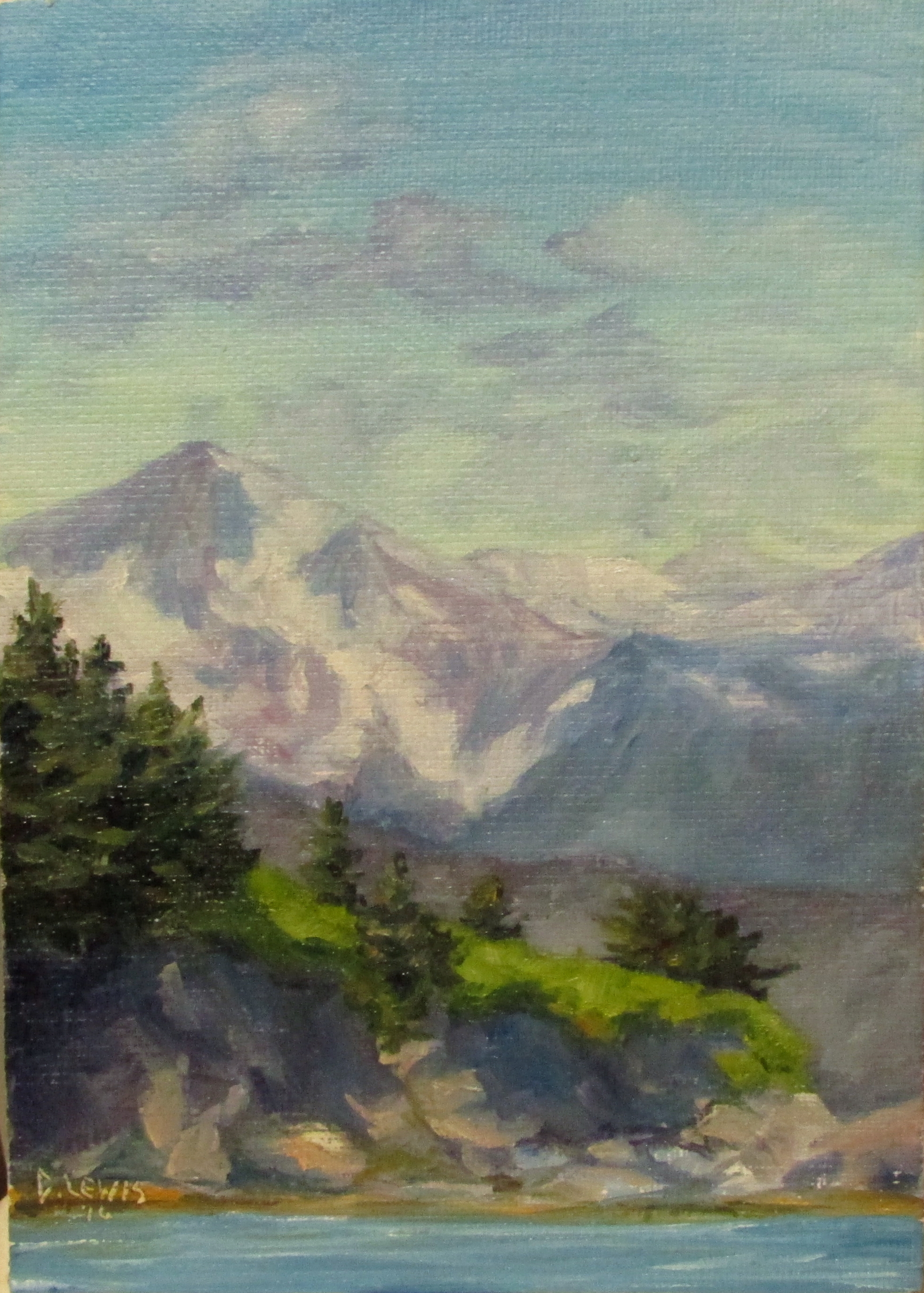 This is a 5×7 oil painting of a point outside Juneau, AK. When I took this photo, I just loved how the blue reflection on the shady parts of the rock seemed so blue and complemented to bright, vivid green of the grassy knoll. But when I started this picture I was really intending to practice my skies. I have trouble keeping them light enough, and I’d like to be able to get better blues into them. So on this one I was trying to use some Cerulean Blue…I usually use Pthalo. I used both here, starting with Cerulean near the mountain peaks and gradually going to Pthalo as the sky got higher. this is not how my photo looked, but I was happy with it. After the sky was done I figured I’d just add the rest…and here it is. I think I will try to do some quick practice though of mainly skies. Because I started with the sky I ended up running out of the proper proportion of water at the bottom. I think this would be much more pleasing to the eye if it had a couple more inches of water, but there’s always next time.