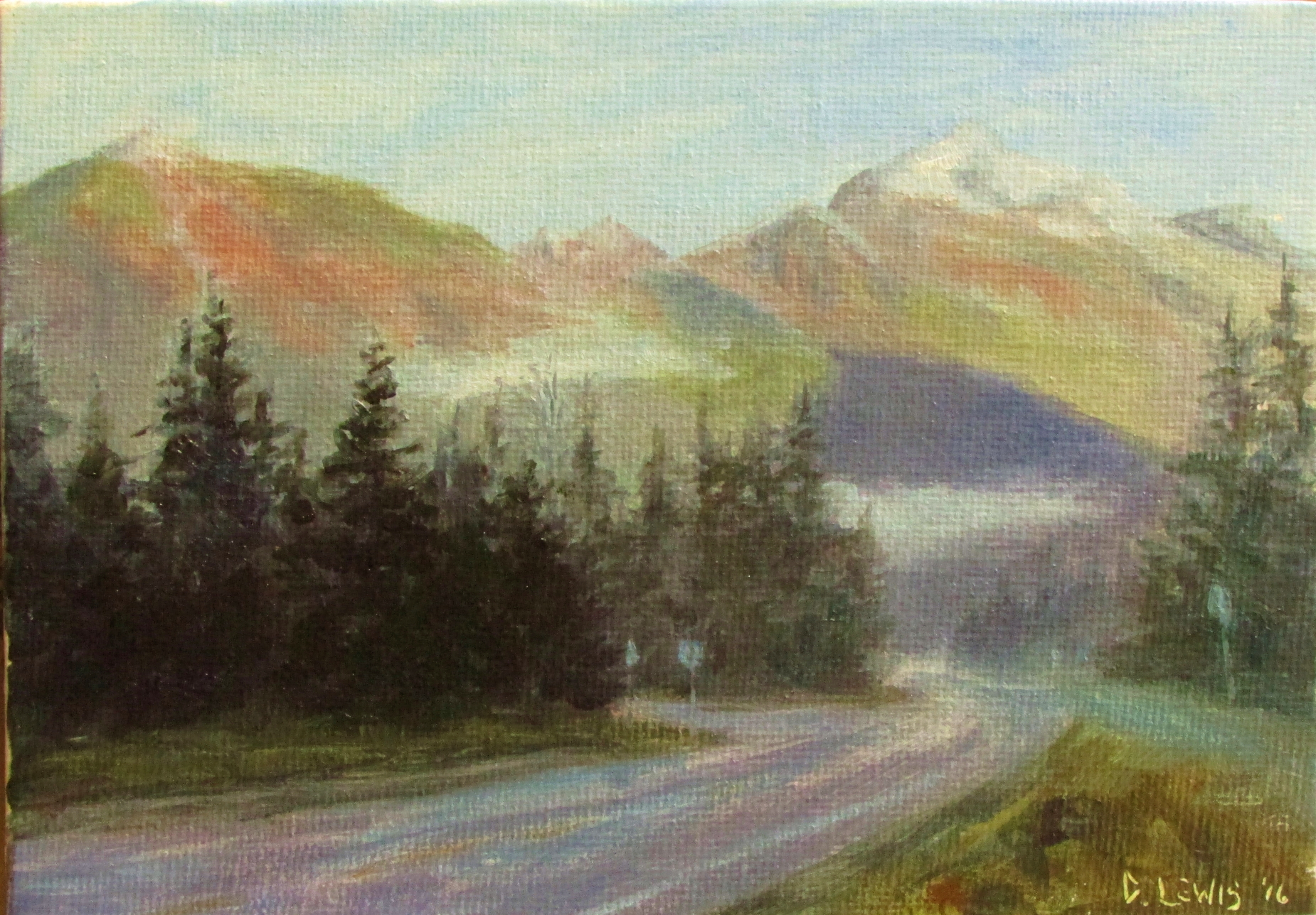 Another morning walk to Mendenhall Glacier. It is beautiful no matter what the weather. On this morning the fog was just clearing. I liked the warm reds on the peaks contrasted with the deep purple in the shadow from another mountain. And of course the little bits of left over fog are always interesting. This is a 5×7 oil on canvas…mostly meant to be a study of the light effects.