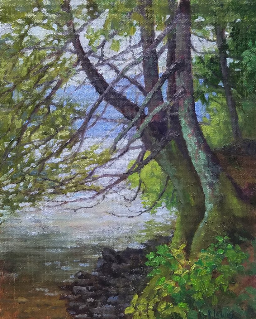 This piece is 10x 8 inches and was mostly done outside on location. I did do some adjustments when I got it back to the studio, but this was my most challenging paintings outside. I particularly like the contrast of the greens with the maroon in the tree bark on the spruce trees here. This is a very typical scene here in Juneau.
