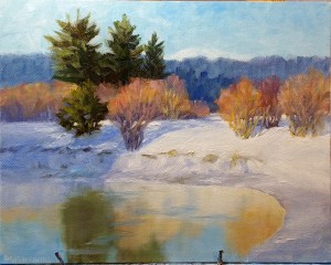This is a 6×6 painting, and it is the first painting that I have done on Gesso board. I have been wanting to try this since my first post. I read in Carol Marine’s book that she uses it and likes it. There are several artists whose paintings have a smooth flowing brush stroke style and I have been unable to get that in my paintings. It seems like they must either use gesso board or a smoother canvas than I do. To save on cost, I have given into using an inexpensive canvas board most of the time for these small practice pieces. But it does not help to practice what doesn’t work for you. I need to begin either using Gesso board or prepping my canvas in a different way to create a smoother finish. I have recently found another brand of canvas board that is not too expensive and does have a wonderful smooth coating. (the brand is Art Advantage) I cannot get it here in Juneau, and shipping is always expensive to Alaska so I have not used it on a regular basis. But I am beginning to think I should. I will have to get a bunch when I travel back to Maine next month.