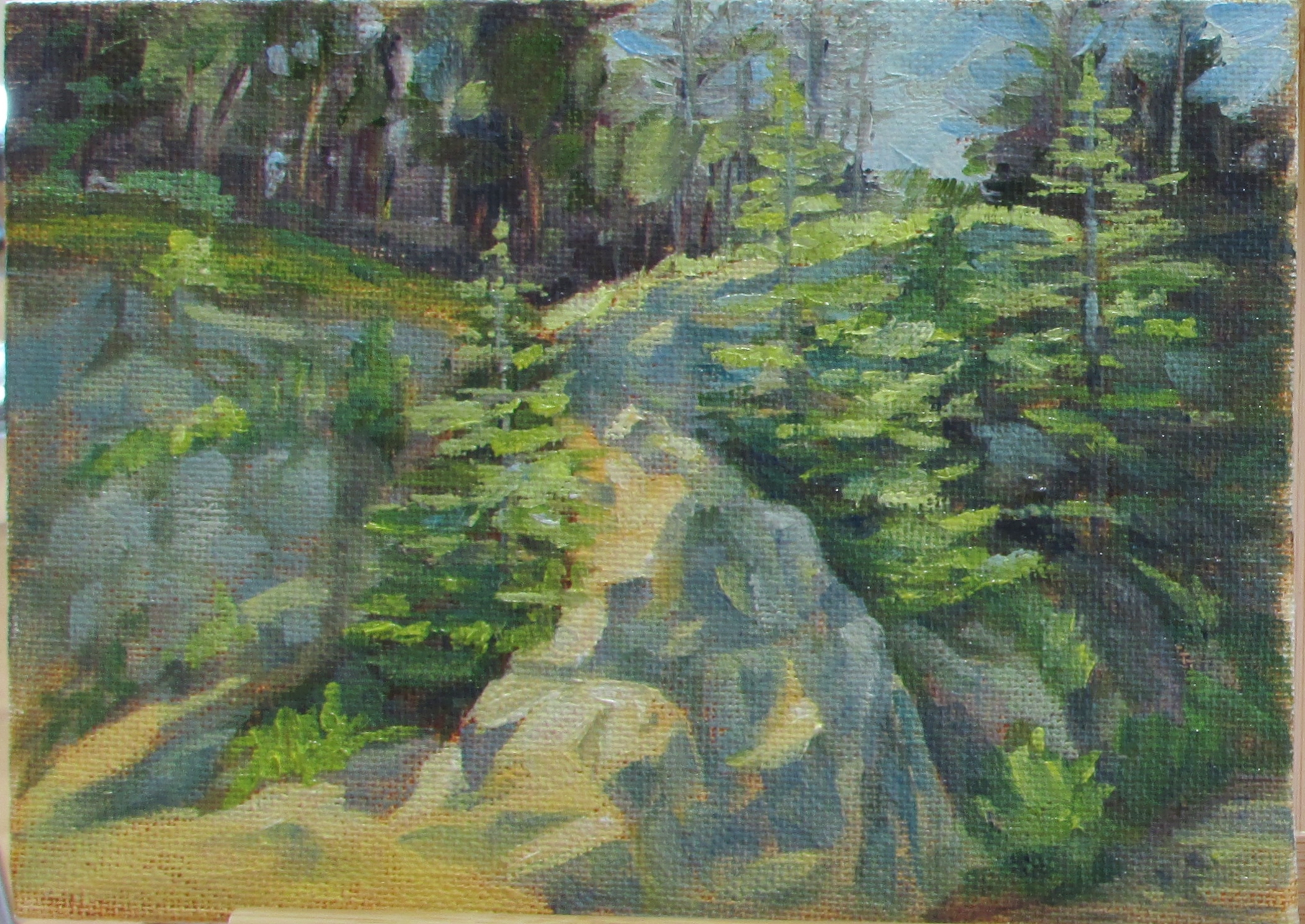 This little canvas was underpainted with a pale blue hue. I think this was the first time trying blue. I liked it a lot. The overall tone of the painting came out cool even though it was a very sunny scene. After taking this photo I did tone down the blueness of the rocks in the shade. It was a little too blue for me. But I really enjoy painting on a canvas that is underpainted because it gives you a mid tone color to start with which can help you read your colors better. It is also interesting to play around with little bits of color you leave showing. If I did this same painting with the pale orange underneath, it would have taken a totally different direction. I’m almost interested enough to try that in order to compare the two.