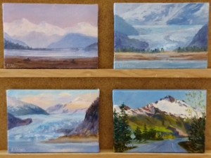 So recently I had the privilege to join the local Artist Gallery here in Juneau,AK. And I have lots of these little minis. So I’ve decided I’d better keep on painting them. There is no shortage of great, inspirational scenery here to paint. I almost never go out without my camera to keep lots of great photos on hand to choose from for painting. So the next several posts will be of more minis of local Juneau scenes.