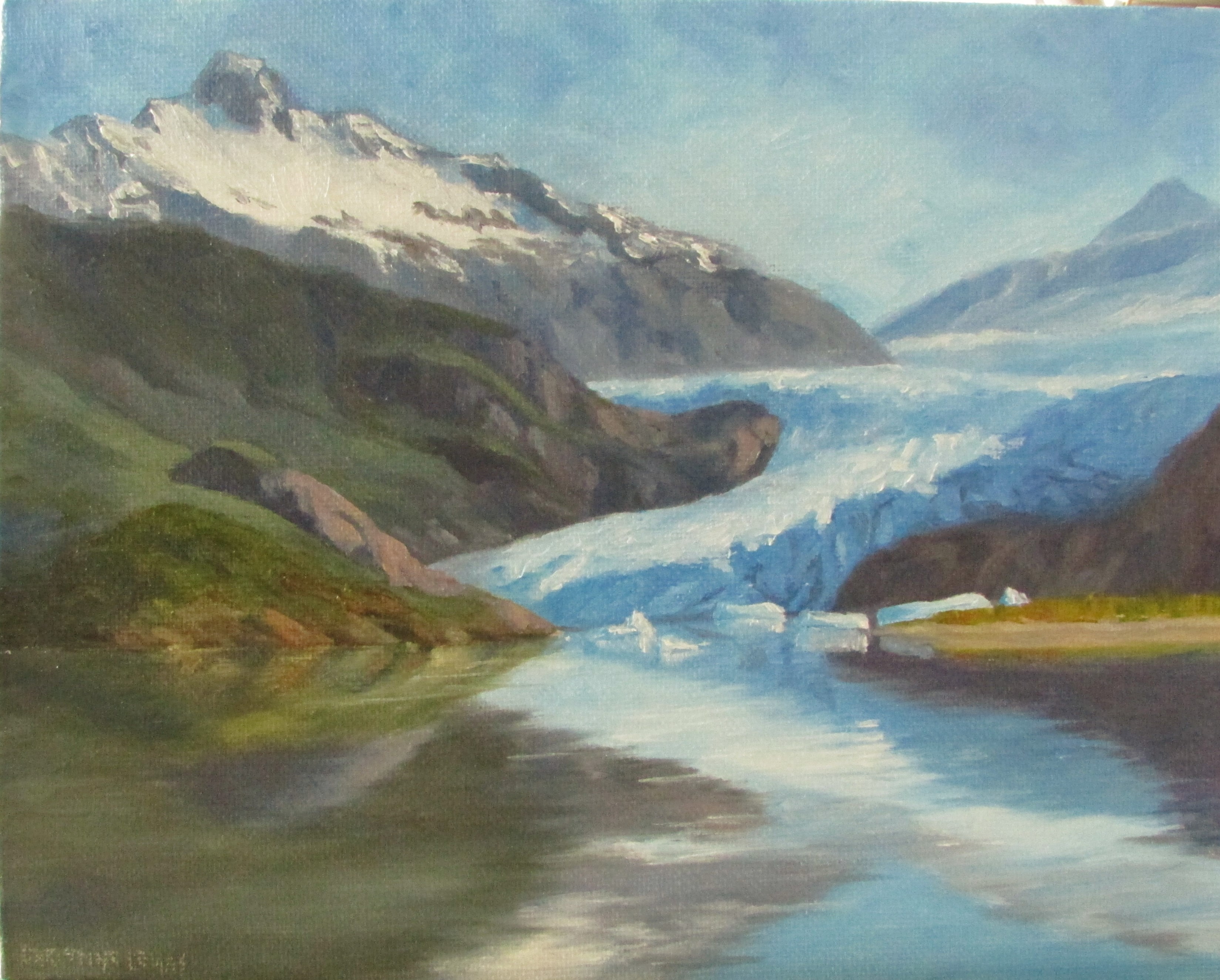 Mendenhall Glacier has become one of my primary subjects. It is only 3-4 miles from my home and always a beautiful place to take pictures. We have a lot of tourism here in Juneau so it also makes for a perfect painting subject to sell to tourists. Hence, my newest paintings are of the Glacier. This one is from a very clear bright day and very different than most days here. But I really liked this shot. All the colors are quite cool, but I tried to add a few touches of warmth in the green grasses and around the base of the most forward area on the left. I also used Pthalo blue in the Glacier, which is a rich, warm blue. (this is an 8×10 oil)