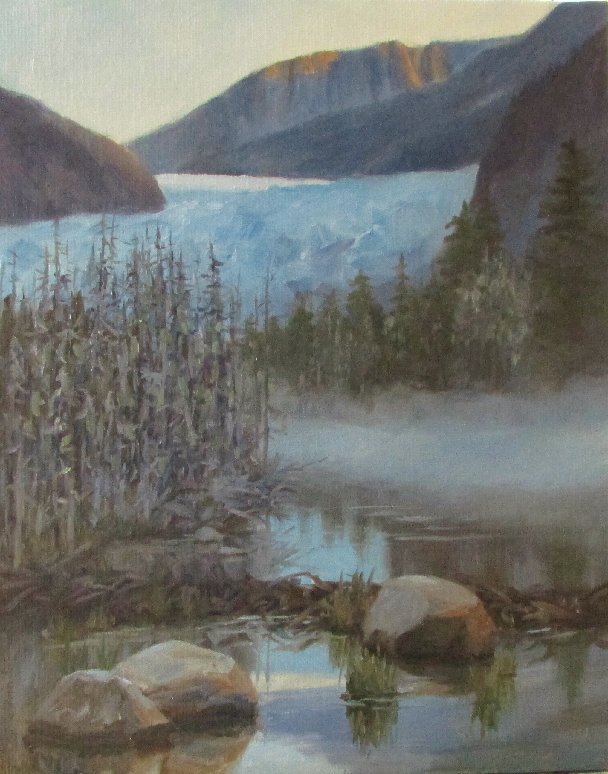 This is another 10×8 oil of Mendenhall Glacier. I love this view from a large stream up the road as you approach the Glacier. There is often fog here and sometimes you can only catch a glimpse of the glacier itself, but it is very interesting to me when it is like this. There are always wonderful reflections in the areas of water around the glacier and this is one in particular that I like because of all the dead trees in the water, giving it a nice textural quality. As a note though, I find these trees extremely difficult to paint. I have found them very challenging. So in order to overcome this, I will be painting them quite a lot for practice ( =