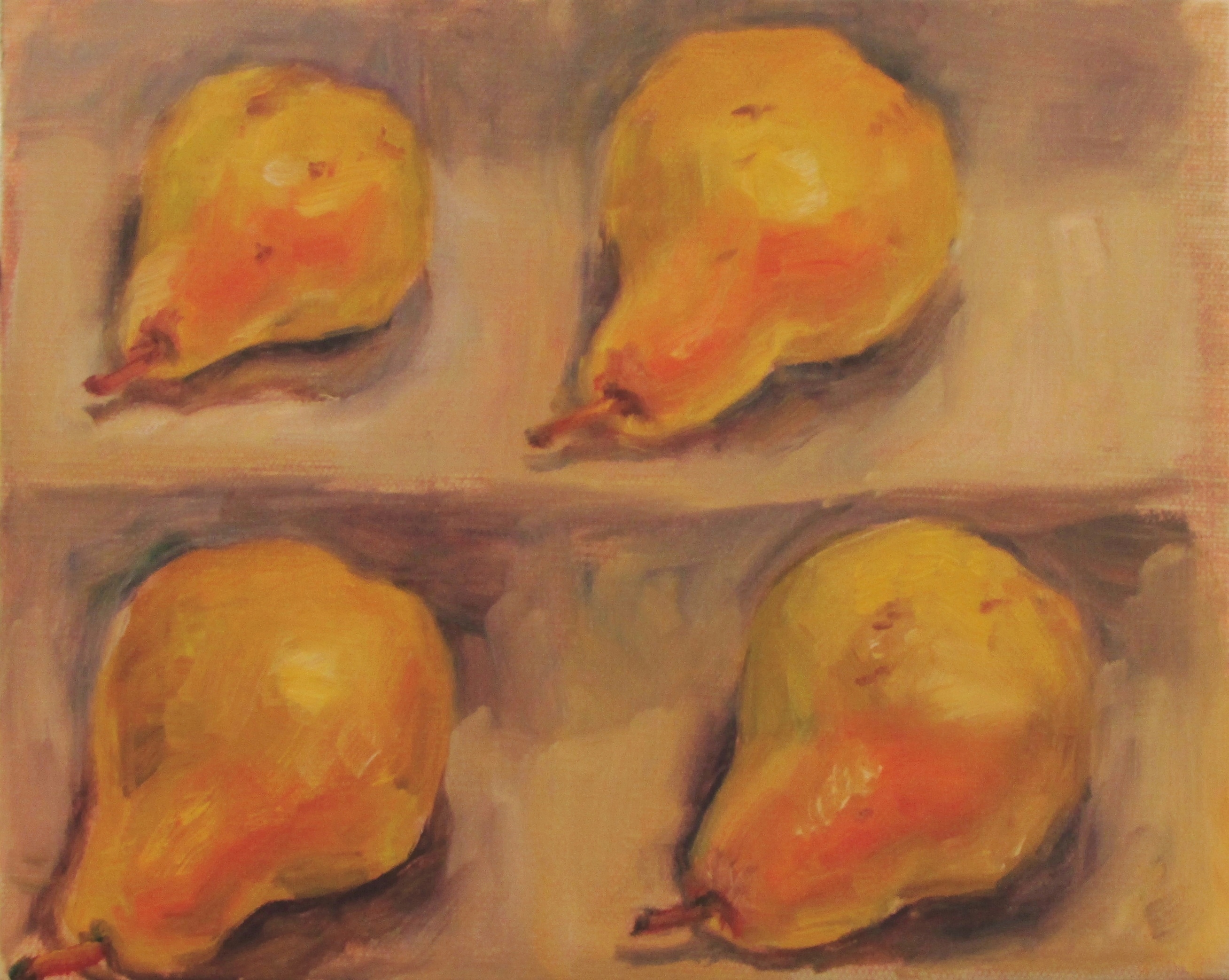 his study, was to get to the point where I could put down brush strokes with confidence. I did not want to overwork these things. My first 4 were horrible. They took me about 1 hour each and I’m not even sure that at that point they looked enough like pears to suit me. I actually scraped off the next several attempts. Ugh!