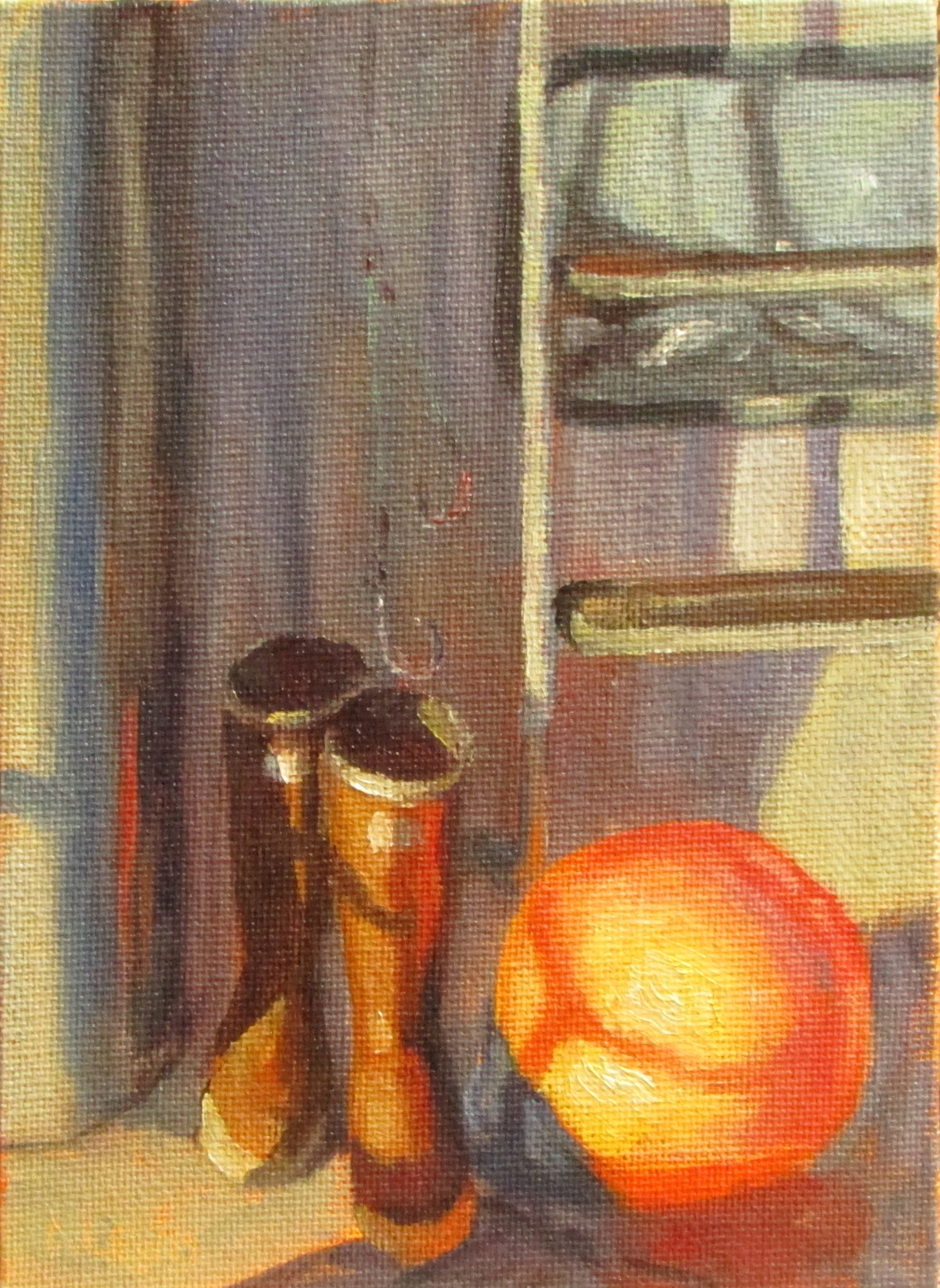 This is a 5×7 oil painting. I took the photo used for this on the back of our boat. It was early morning and the sunlight was extremely low and intense. In this study I was trying to work on creating the intense glow of the bright orange buoy. It fascinated me to see how much it cast its brightness onto the surrounding items. I did a workshop last year where we were challenged to do the same thing. My results on that painting were not quite as successful as this one. I definitely learned a few things from that workshop. This is just another example of how it can be very helpful to do the same picture more than once, or at least something very similar.