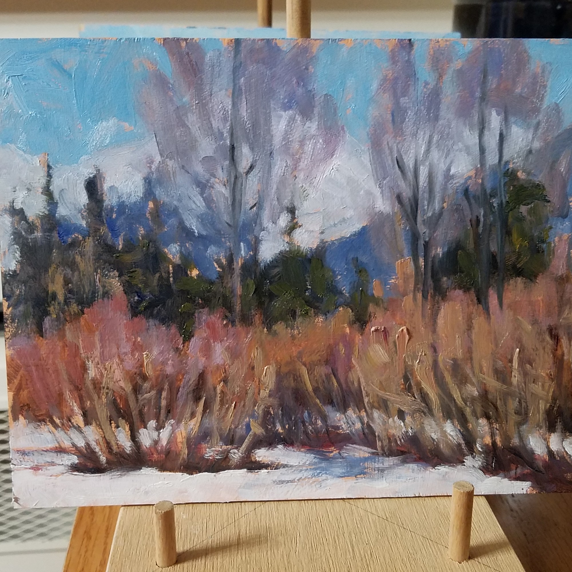 It would be possible to paint these mountains many, many times without ever repeating the look. They look a bit different every single day. So I actually took advantage of this fact to get in some practice using my outdoor painting set up. I definitely was learning a lot.