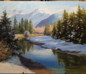 I love doing scenes like this that are very soft and subtle! They are usually challenging but rewarding. This is the Chilkat Mountain range here in Juneau. They are just spectacular, especially when snow-covered. This piece is a 5×7 oil on panel