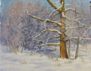 Trees seem to be very challenging, but I am pretty sure they are my favorite subject. Therefore I must practice! This was an 8×8 study of a scene that was very muted and almost monochromatic because of the snowy atmosphere. I ended up using a palette knife on part of it to force myself to try to be loose. (8×8 Oil on board)